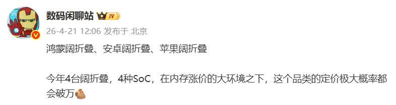 尽管大家都要上阔折叠,在当前内存和芯片成本都在上涨的大环境下,定价是不会低的,预计都将突破1万元大关。