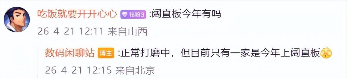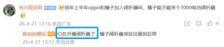 针对网友提出明年上半年OPPO和荣耀是否会加入阔折叠,该博主回复:OPPO已经在开模,荣耀暂没有消息。